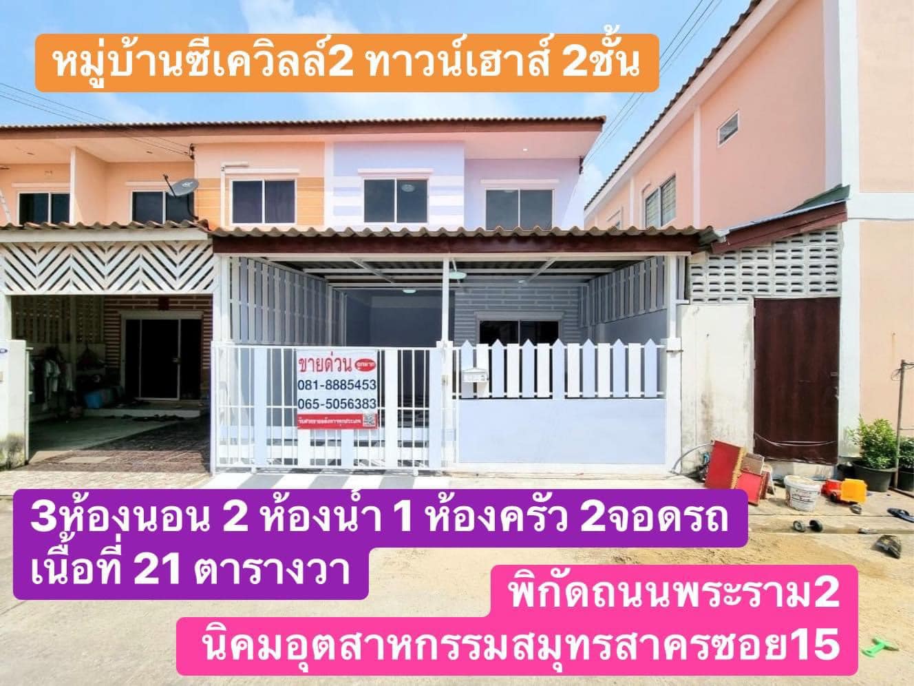 #ทาวน์เฮ้าส์2ชั้น #หมู่บ้านซีเควิลล์2 ซอย7 อยู่ถนนสวนส้ม ใกล้ถนนพระราม2 นิคมอุตสาหกรรมสมุทรสาครซอย15 ทำเลดีสุด แหล่งชุมชน เดินทางสะดวกมากกก